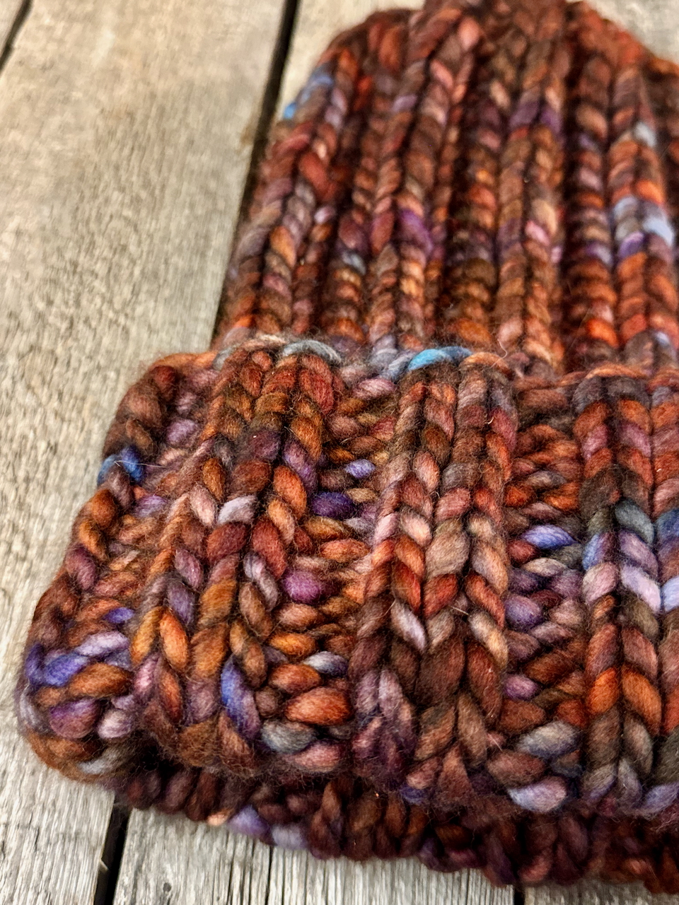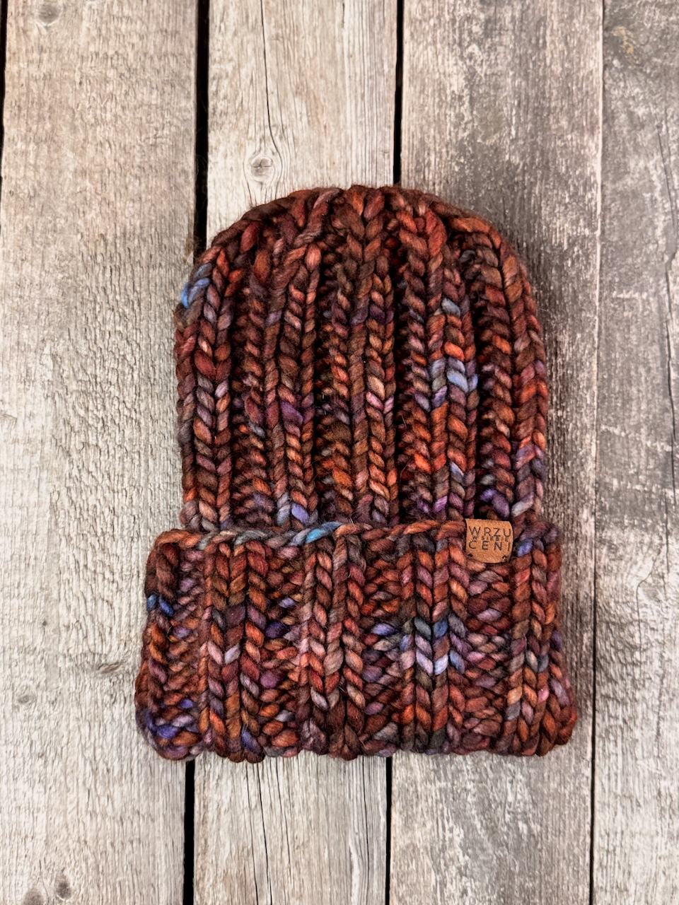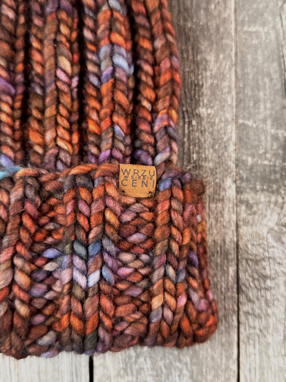 Ręcznie robiona zimowa czapka z wełny merino. Każdy egzemplarz jest unikalny dzięki ręcznemu farbowaniu włóczki – kolory za każdym razem układają się inaczej.